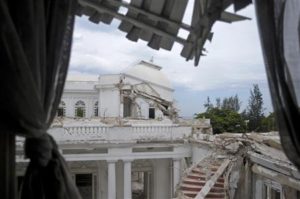 A view of the collapsed cupola and a courtyard of the National Palace in Port-au-Prince August 13, 2012. The palace was destroyed in the 2010 earthquake which killed an estimated 200,000 people, and the planned demolition to make way for the construction of a new one is delayed. REUTERS/Swoan Parker