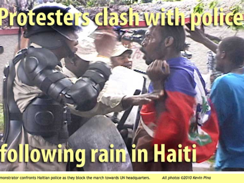 by Kevin Pina US marines watches as demonstrators march towards UN headquarters near the airport Demonstrators clash with Haitian police Sign reads: “The rain has…
