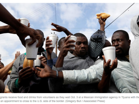 Haitian migrants receive food and drinks from volunteers as they wait Oct. 3 at a Mexican immigration agency in Tijuana with the hope of gaining…