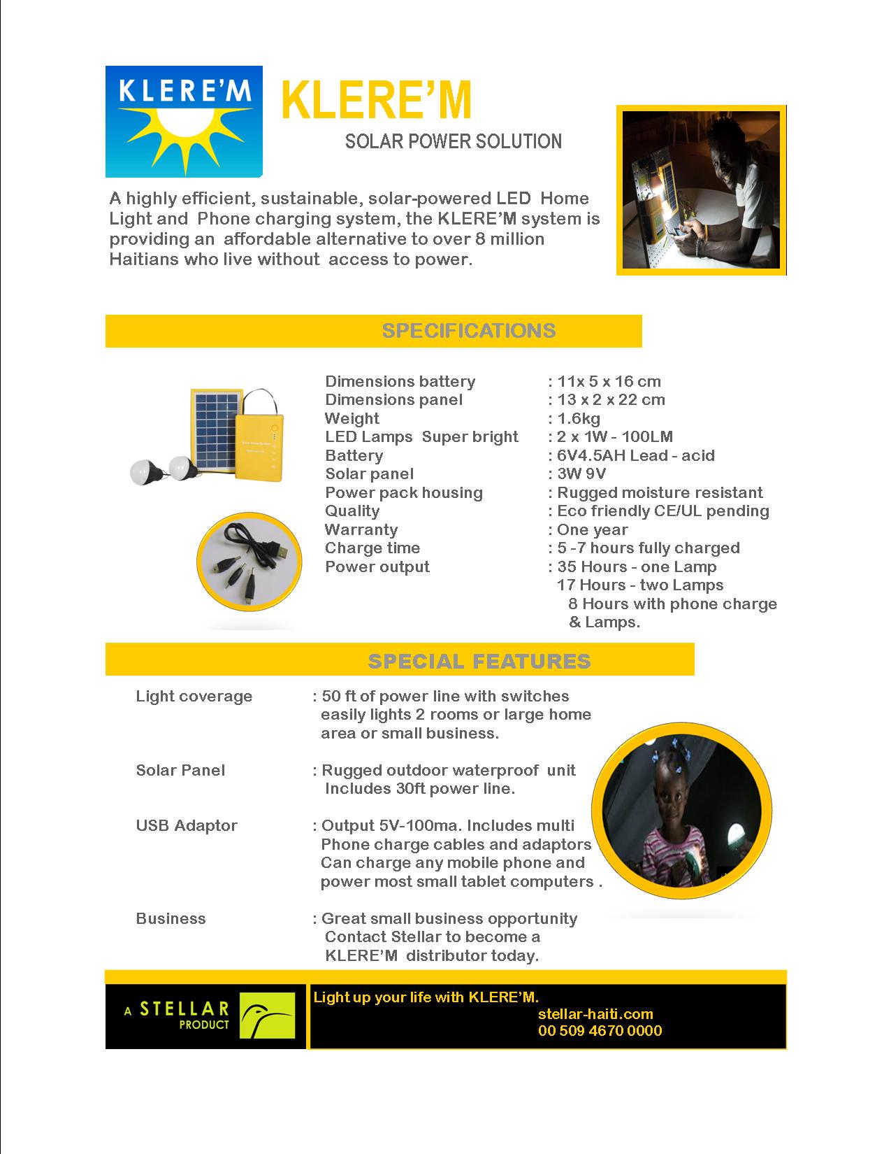 Stellar Haiti is happy to be a part of this call to action, this project will help restore Haiti’s plant population, Stellar and its partners, AVM, Wynne Farm Ecological Reserve, Earth Society Foundation, Telecom S.A. and Serenity Eco Resorts, are committed to giving back to the country. With the “1,000,000 Trees for Haiti” campaign we promise to plant a tree for every KLERE’M unit distributed. The trees will be planted in protected sites to sustain growth. With this program, KLERE’M not only provides a valued solution to lighting & power problems to people off the grid countrywide but also helps Haitian agriculture grow and develop with the planting of sustainable food bearing trees.