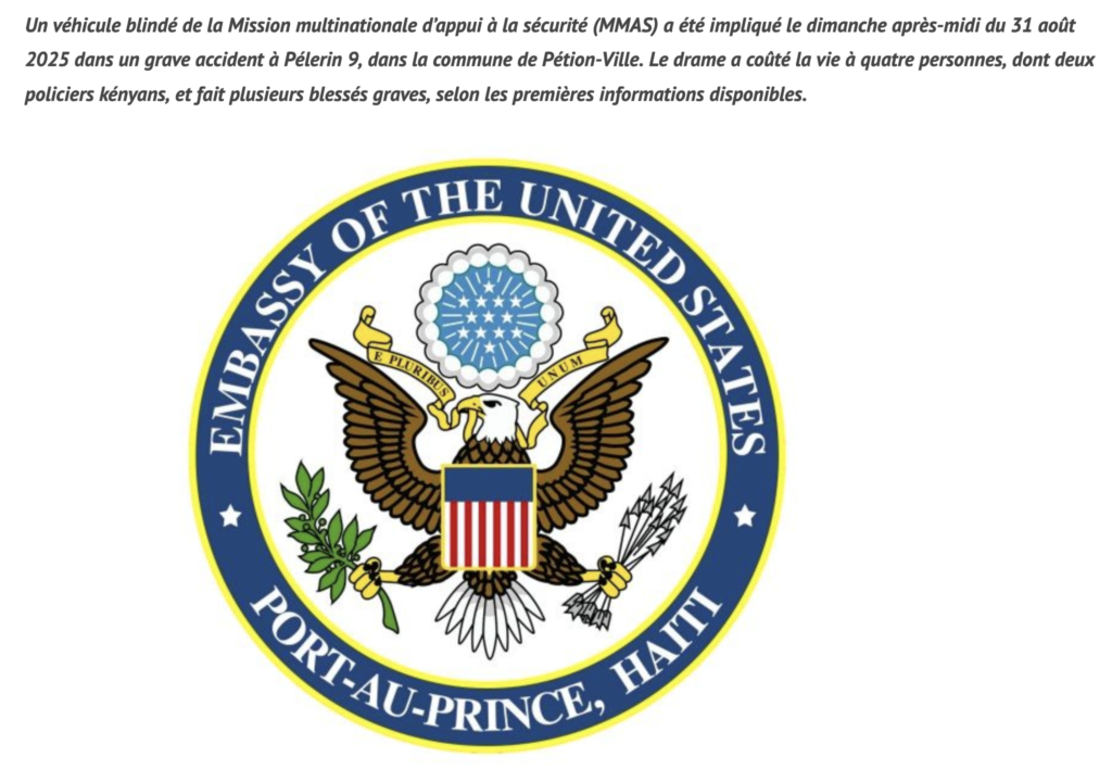 Tabarre, 31 août 2025. – L’accident se serait produit alors qu’un convoi de deux blindés revenait d’une mission à Kenscoff. Les freins de l’un des engins auraient lâché dans une descente, provoquant la perte de contrôle du véhicule.