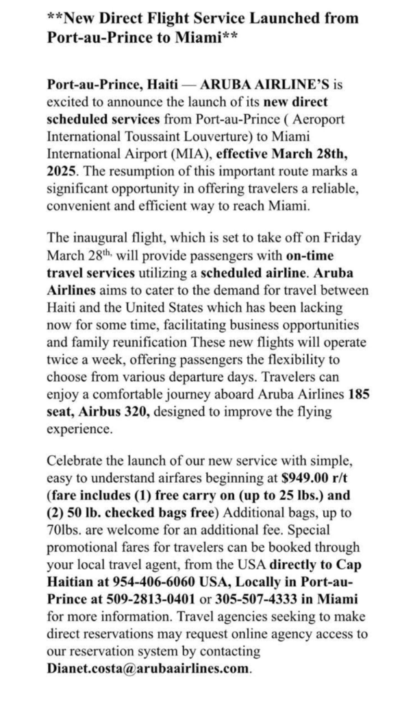 Posted in DAILY REPORTS-Direct From Haiti Aruba Airlines announces direct flights from Port-au-Prince to Miami ` March 11, 2025 Author: `