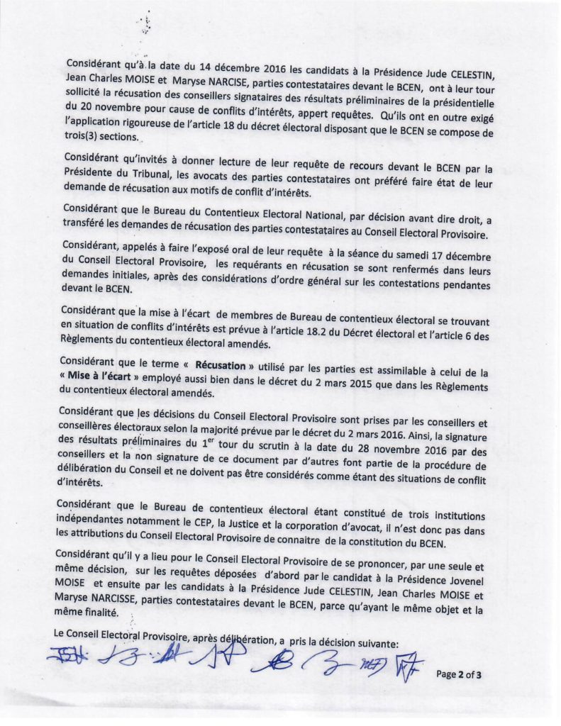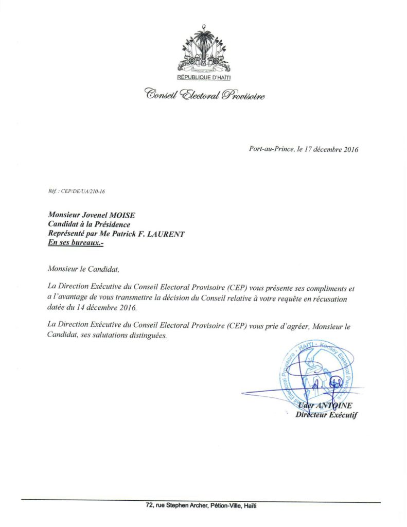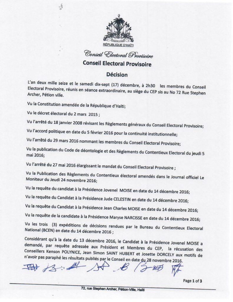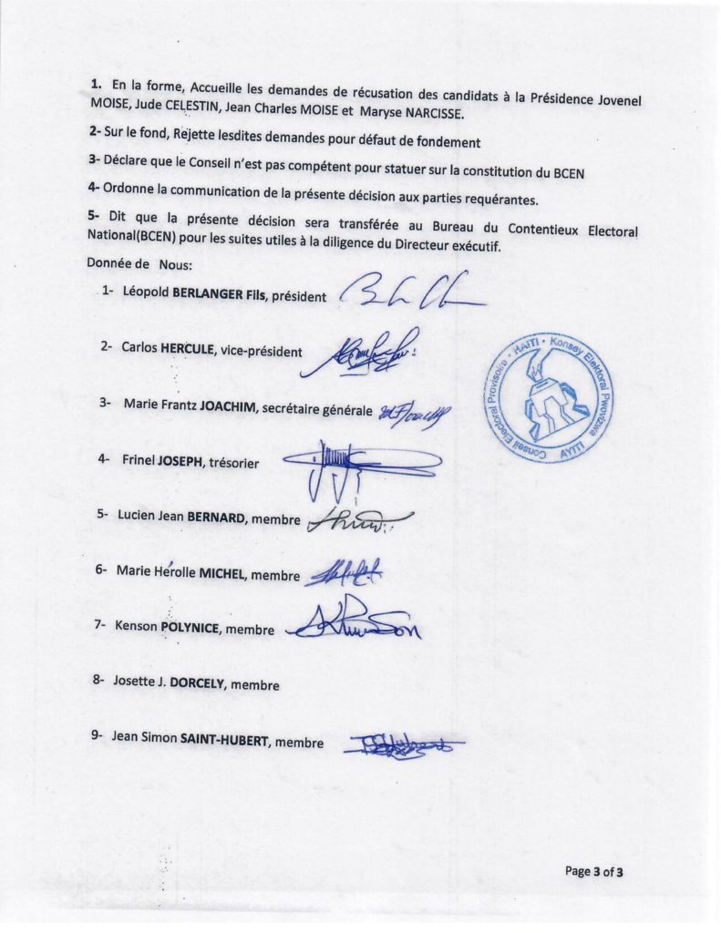 The statement noted that the CEP, after deliberation, rejected the claims of the presidential candidates — Jude Celestin, Jean Charles Moise and Maryse Narcisse because “these claims (were) unfounded and the CEP “is not competent to rule on the constitution of BCEN”.