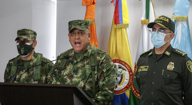 General Luis Fernando Navarro, center, the commander of the Colombian armed forces, and General Jorge Luis Vargas, right, the head of the national police, at a news conference on Friday about former Colombian soldiers accused of participating in the assassination of Haiti’s president, Jovenel Moïse.Credit…Ivan Valencia/Associated Press