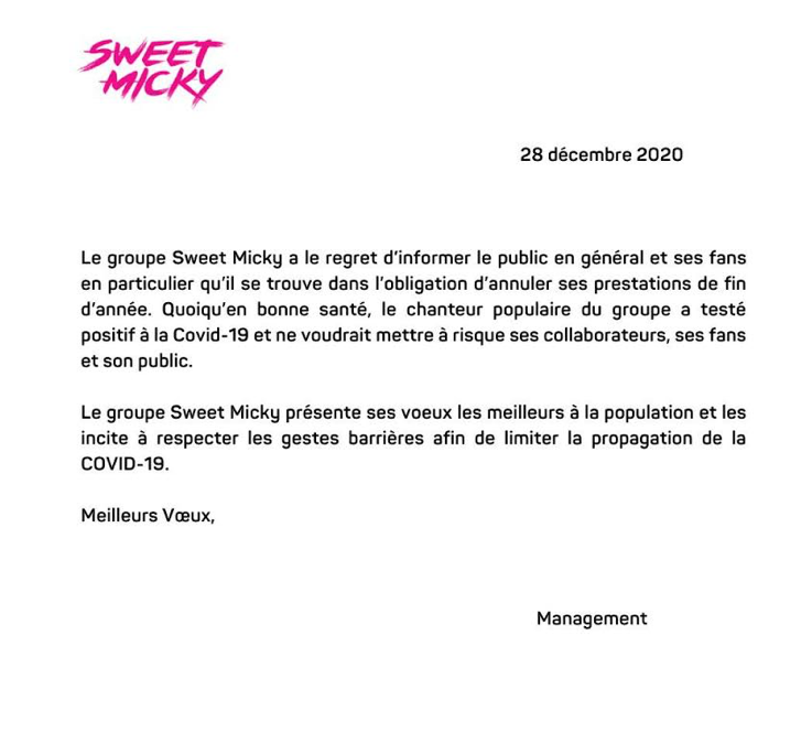 La star du groupe Sweet Micky, testé positif au nouveau Coronavirus et annule toutes les activités du groupe.