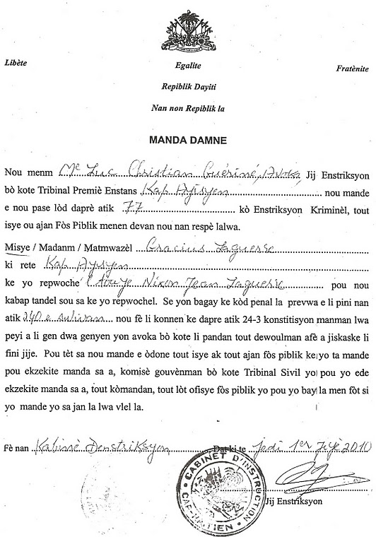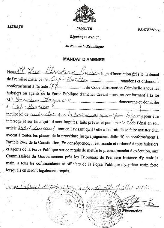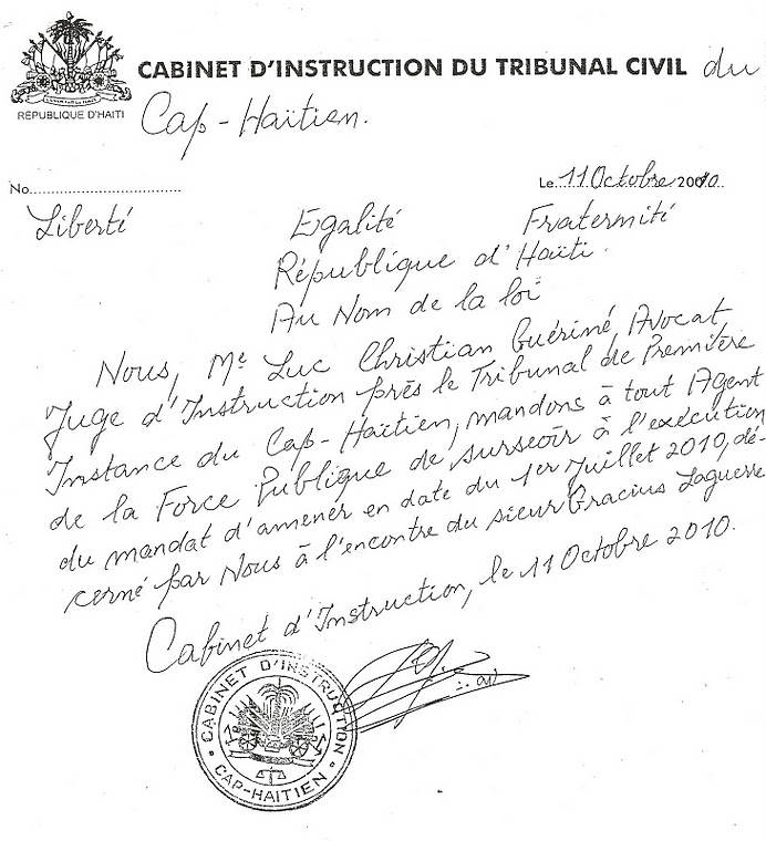 Pour aider le Parti du Président René Préval – INITE à remonter la pente au Cap-Haïtien, le gouvernement a décidé de forcer le Juge d’instruction Me Luc Christian Guériné d’annuler le mandat d’amener lancer contre Gracius Laguerre, le Casec de la Bande du Nord, section communale de Cap-Haïtien, en cavale depuis le 23 octobre 2009, pour avoir abattu de sans foi, le jeune Nixon Jean-Laguerre dans le bureau de Administration de la Section.