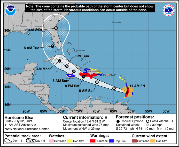 The hurricane center has low confidence in the extended forecast track. Some weather models predict Elsa turns and stays east of Florida, while others take it into the Gulf of Mexico, leaving the entire Florida Peninsula in the cone of error.