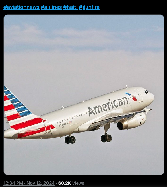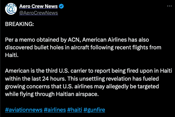 And American Airlines said Tuesday it would suspend daily service between Miami and Port-au-Prince through February 12 after it discovered one of its planes was also hit by gunfire. The airline said it inspected flight 819 from Toussaint Louverture International Airport in Port-au-Prince after it landed in Miami on Monday. Nobody on board was hurt.