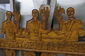A wooden sculpture depicting former Haitian President Jean-Bertrand Aristide rests against a wall of the the badly damaged Haitian National Palace in Port-au-Prince August 13, 2012. REUTERS/Swoan Parker