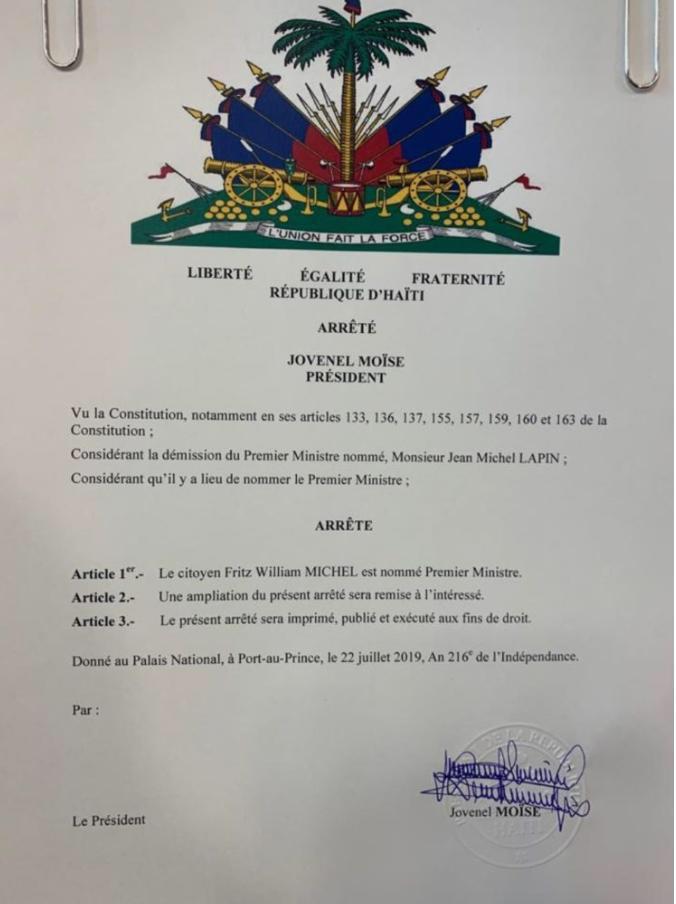 Pour faire face aux urgences de l’heure,et suite à la démission de M. Lapin, j’ai fait choix,en consultation avec les présidents du Sénat et de la Chambre des Députés,du citoyen Fritz William Michel comme PM, en attendant la ratification de sa Déclaration de politique générale.