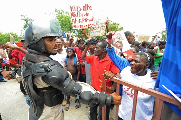 Haitians face riot police as they demonstrate near the presidential palace in Port-au-Prince on May 17, 2010 against President Rene Preval’s decision to extend his presidential mandate by three months to May 14, 2011. Haiti’s government proposed on May 6 extending Preval’s term by three months in the event the quake-devastated country cannot conduct elections planned for later this year. The move comes with election plans in doubt with Haiti still reeling from the January 12 earthquake that killed between 250,000 and 300,000 people and left another 1.3 million homeless. AFP PHOTO/Thony BELIZAIRE (Photo credit should read THONY BELIZAIRE/AFP/Getty Images)
