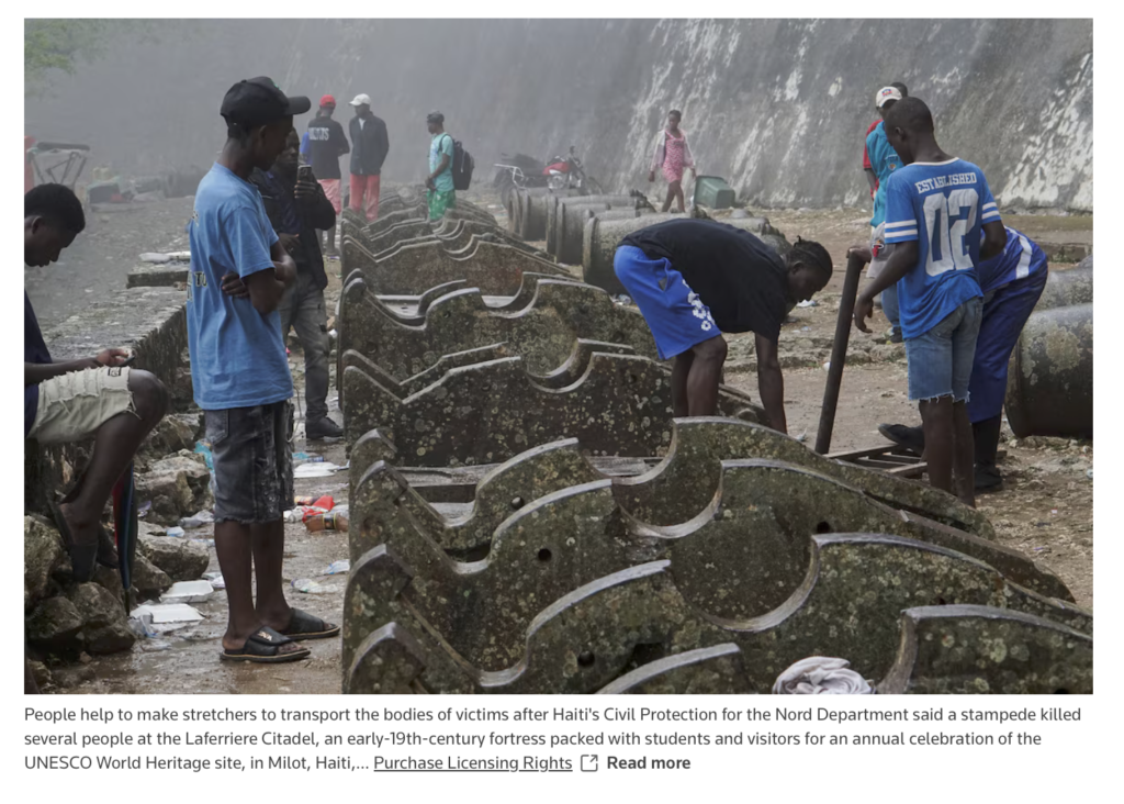 PORT-AU-PRINCE, April 12 (Reuters) – Haiti declared three days of national mourning on Sunday, a day after a deadly stampede killed 25 people during an annual celebration thronged by students and visitors at its Laferriere Citadel tourist attraction.