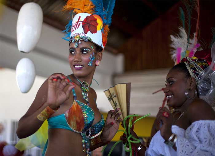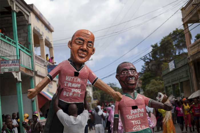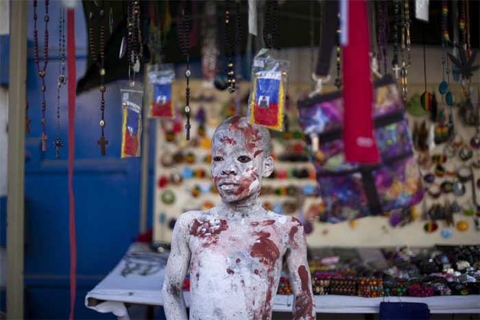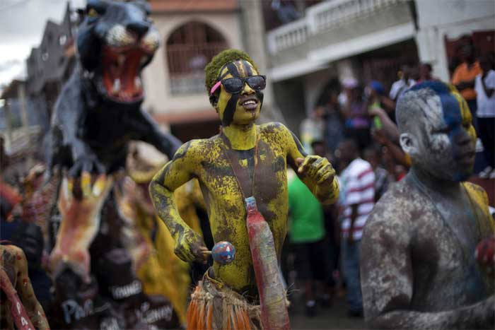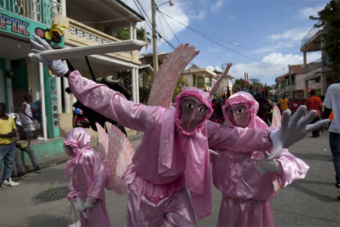 A man with his body painted attends Carnival celebrations in Jacmel. The city of Jacmel is known for its arts to kick off Haiti’s pre-Lent festival. (AP Photo)Jeanjean Robert, 53, pretends to paint his face during Carnival celebrations in Jacmel, Haiti. People sporting painted faces or papier Mache masks paraded the streets of this town known for its arts to kick off Haiti’s Carnival festivities. (AP Photo)Carnival Queen Fabienne Francois dances at Carnival celebrations in Jacmel, Haiti. (AP Photo)The Carnival spirit took hold as Jacmel’s annual parade snaked through the downtown of this coastal town revered among Haitians for its artists and artisans. A youth with his body painted attends Carnival celebrations in Jacmel, Haiti. The youth is painted in the likeness of an indigenous person from the island of Hispaniola from centuries ago. (AP Photo)Revelers dressed as Archangel St. Michael dance during Carnival celebrations in Jacmel, Haiti. The pre-Lent celebrations later this week will be in the western port city of Gonaives, under the government’s effort to “decentralize” Carnival by holding festivities in different towns in the countryside each year. (AP Photo)