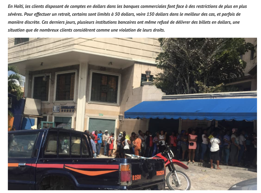Dans certaines banques, les clients se voient proposer des gourdes à la place des dollars, mais au taux de change fixé par l’établissement, souvent bien inférieur à celui publié par la BRH. Parfois, on leur conseille de se rendre dans une autre succursale pour obtenir le montant souhaité. Les banques évoquent fréquemment des problèmes de liquidité pour justifier ces restrictions.