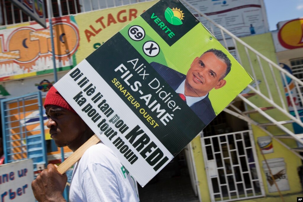 A supporter of the political party Platform Vérité carries a poster of parliamentary candidate Alix Didier Fils-Aime in Port-au-Prince, Haiti, Aug. 7, 2015.