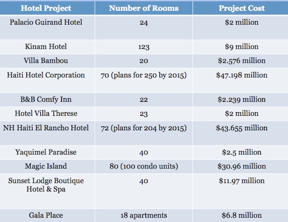 According to data from the Ministry, the total includes 11 hotels in Haiti, and 474 rooms. Another 454 rooms and 100 condominium units could also be on the way over the next several years through additional phases at the projects.