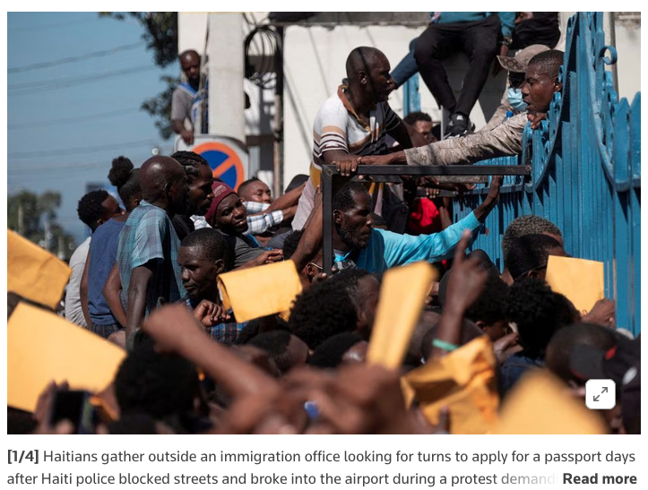 Videos from Haiti’s Lalue migration office and an improvised center at a sports facility in the capital Port-au-Prince show people climbing on railings of stairs and being crushed as they fight their way through crowds, clutching document envelopes.