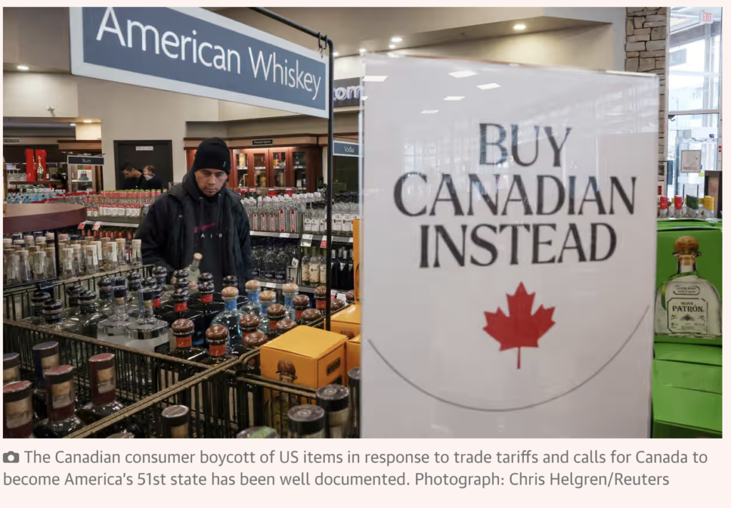 The fall in Tesla sales in Europe has been well documented, as has a Canadian consumer boycott in response to trade tariffs and Trump’s calls for Canada to become America’s 51st state, but the past week has seen daily reports of cultural and other forms of boycotts and disinvestment.