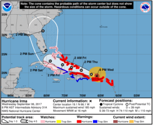 ← IRMA Update- 185 mph winds: It’s currently a Category 5, the highest possible on the hurricane scale. It packs winds of 185 mph, making it one of the most powerful Atlantic storms ever recorded.
