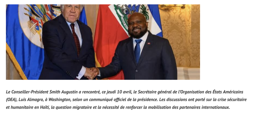 Pour sa part, Luis Almagro a exprimé une écoute attentive et a proposé l’organisation d’un symposium régional urgent sur la sécurité en Haïti. Ce symposium aurait pour objectif de mieux cerner les racines de la crise, de définir une réponse stratégique internationale et de susciter des engagements financiers concrets.