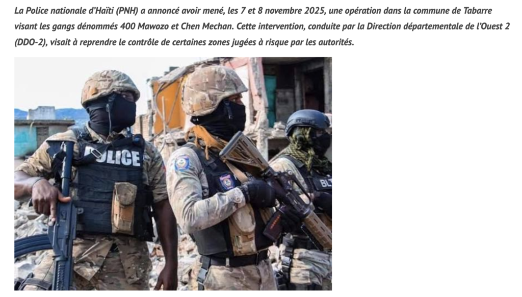 Port-au-Prince, le 9 novembre 2025. — Selon un communiqué de la Direction de la Communication de la Police (DICOP), l’opération a permis de reprendre le contrôle du Carrefour Marassa, un axe stratégique régulièrement disputé par des groupes armés.