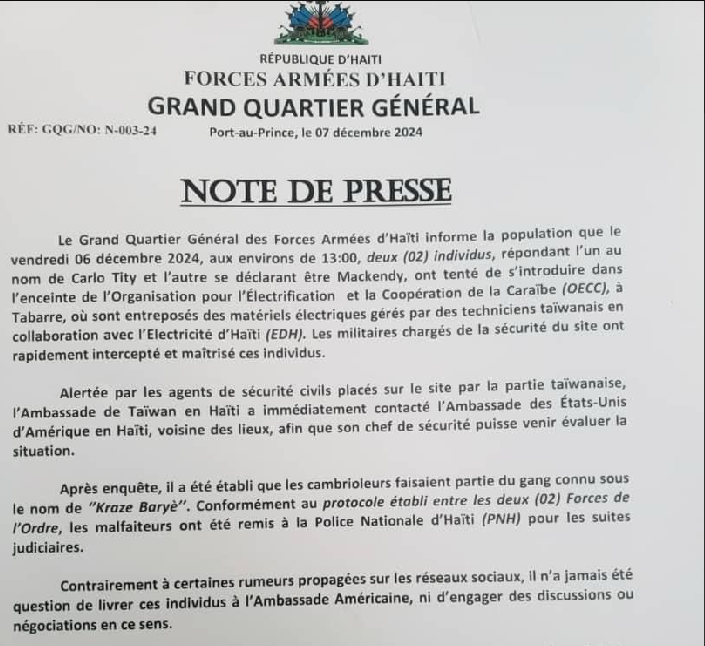 Selon l’émission de Theriel Telus de ce vendredi 6 décembre 2024, des bandits appartenant au groupe armé dirigé par Vitelhome ont tenté de briser les murs de la base du FAd’H (Forces Armées d’Haïti) à Tabarre.