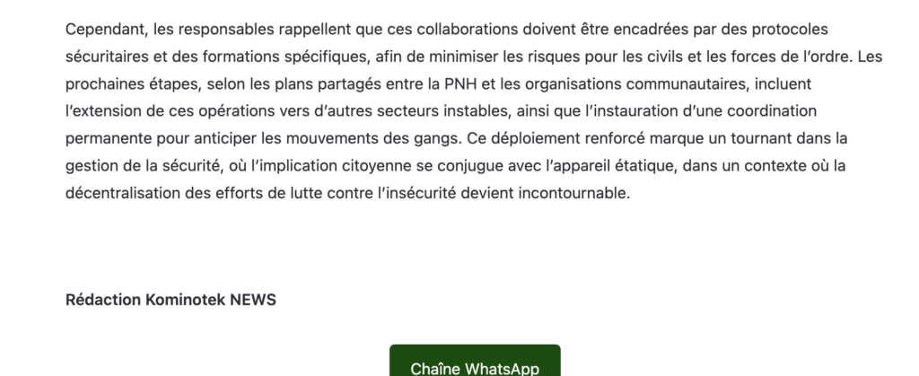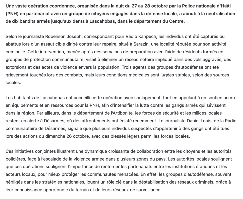 Posted in Crime/Corruption, FRENCH/CREOLE Articles Lascahobas : dix bandits neutralisés lors d’une vaste opération de la PNH et des civils ` October 30, 2025 Leave a comment Author: `
