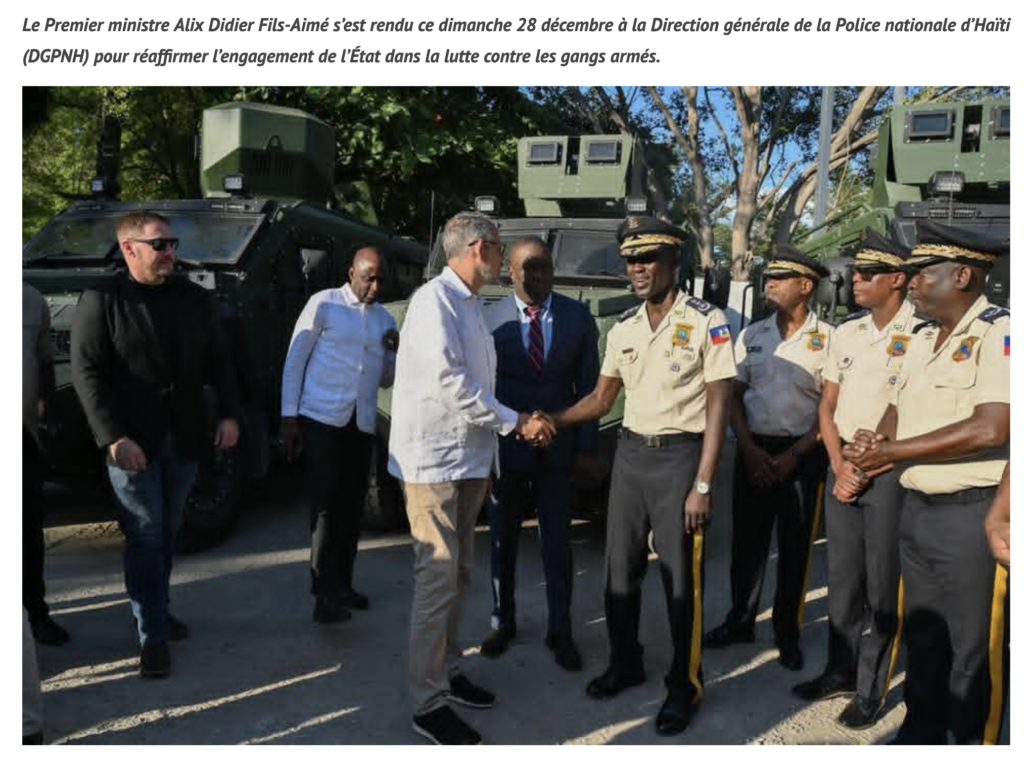 Port-au-Prince, 28 décembre 2025. Accompagné du ministre de la Justice, Patrick Pélissier, du secrétaire d’État à la Sécurité publique, Mario Andresol, ainsi que du haut commandement de la PNH, il a présenté la dotation de 25 véhicules blindés offerts par le gouvernement américain. Ces équipements doivent renforcer la sécurité des unités sur le terrain et permettre la reconquête des zones contrôlées par les groupes armés.