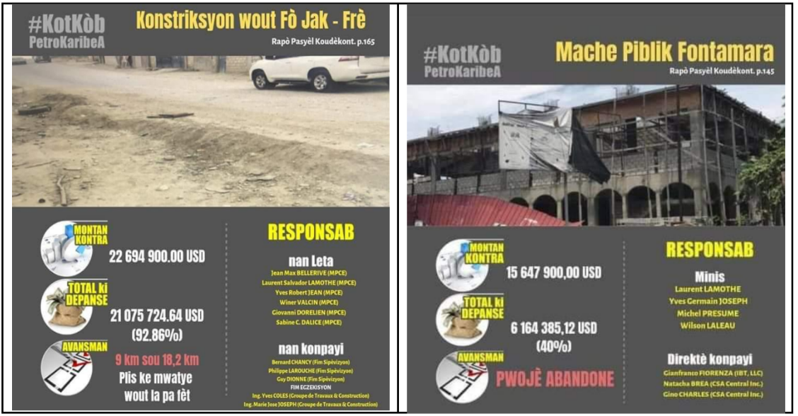J’ai reçu ce matin ces deux images préparées et distribuées à la dilig ence des PetroChallengers, sans doute. C’est le nouveau métier le plu s lucratif actuellement en Haïti. Ces images représentent deux projets réalisés avec les fonds PetroCaribe sur lesquelles on lit distinctement : « Marché de Fontamara et Route de Soisson-Frères, le coût des pro jets, total des décaissements, pourcentages d’avancement, les noms d es firmes d’exécution et de supervision ainsi que les noms des ministr es responsables ». Responsable de quoi ou en quoi? A bien compren dre ils faisaient référence aux différents intervenants de l’administratio n sur les chantiers. Si l’on capte bien, pour ces gens, un ministre qu i n’intervient pas sur des projets publics engagés, même pour défendr e les intérêts de l’Etat et de la société, parfois menacés, serait plus méritoire, à leurs yeux que ceux qui réagissent lorsqu’ils sont requis dans le cadre de leurs fonctions. Ce concept est donc celui des petro challengers.