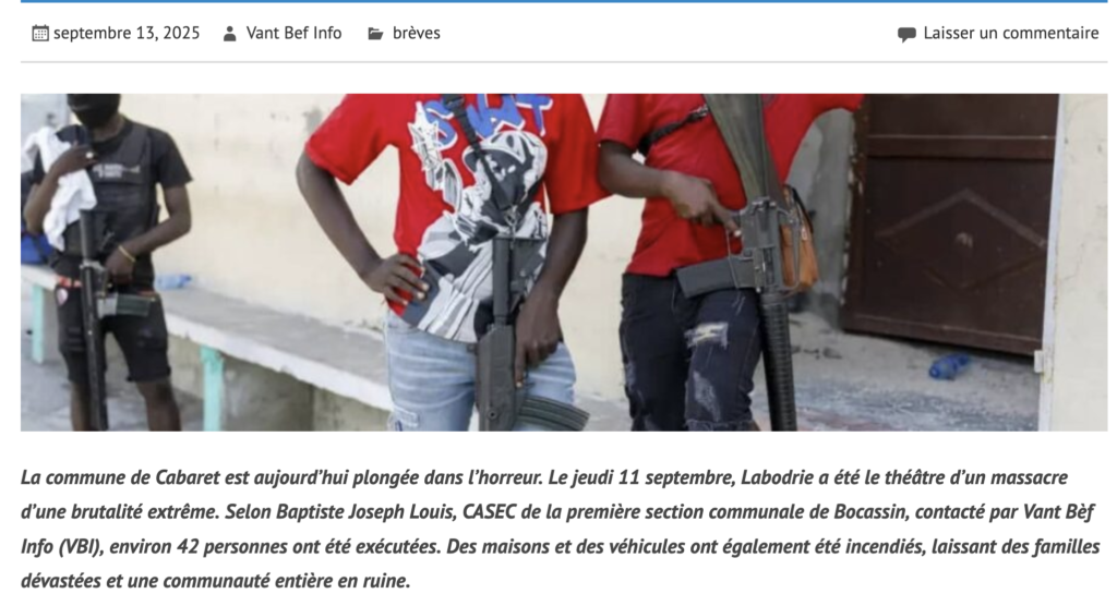 Cabaret, 12 septembre 2025.–Ce bain de sang serait une vengeance menée par des membres de la coalition criminelle « Viv Ansanm », après la mort du redouté chef de gang « Vladimir », alias Vlad, tué lors d’une opération policière le dimanche précédent. Le jeudi après-midi, ses hommes ont lancé une offensive aveugle contre la population civile de Labodrie.