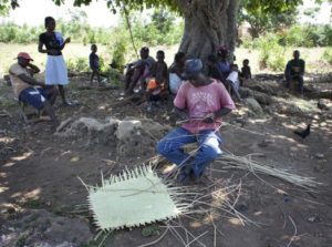 Sourel Brito, one of the families whose homes will be expropriated by Haiti’s government to make way for an international airport, weaves a basket while sitting under a tree with neighbors on Ile-a-Vache island, off Haiti’s south coast, March 25, 2014. For decades the mostly dirt-poor residents of the small island of Ile-a-Vache off Haiti’s south coast lived in anonymity, until last year when the government claimed the 20-square-mile former pirate lair as a “public utility,” potentially stripping the 14,000 residents of their land to develop a high-end tourist resort. Picture taken March 25, 2014. REUTERS/stringer (HAITI – Tags: TRAVEL POLITICS SOCIETY BUSINESS)