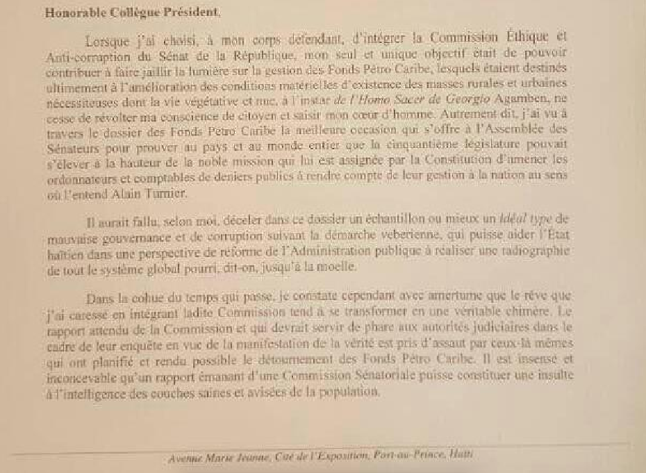 Selon l’élu du Nord-ouest, le rapport que la commission présidée par  le sénateur lavalasien s’apprête à rendre public serait partial et monté de toutes pièces contre des anciens hauts fonctionnaires de l’Etat.