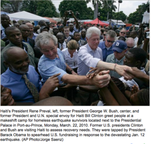 PORT-AU-PRINCE, Haiti — Former Presidents George W. Bush and Bill Clinton clasped hands with residents of one of Haiti’s massive tent cities Monday on a tour of its quake-devastated capital — a visit intended to remind donors of the immense needs facing the recovery effort.