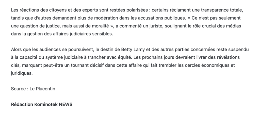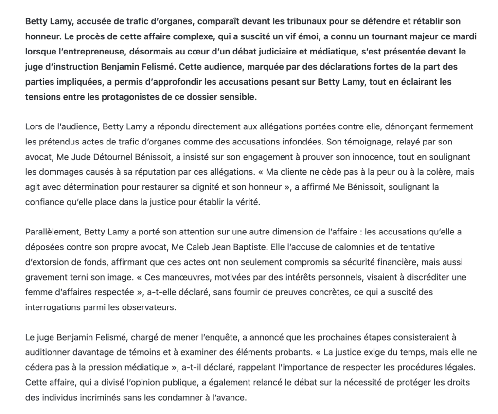 Posted in Crime/Corruption, FRENCH/CREOLE Articles Procès Betty Lamy : l’entrepreneuse clame son innocence face aux accusations de trafic d’organes ` November 12, 2025 Leave a comment Author: `