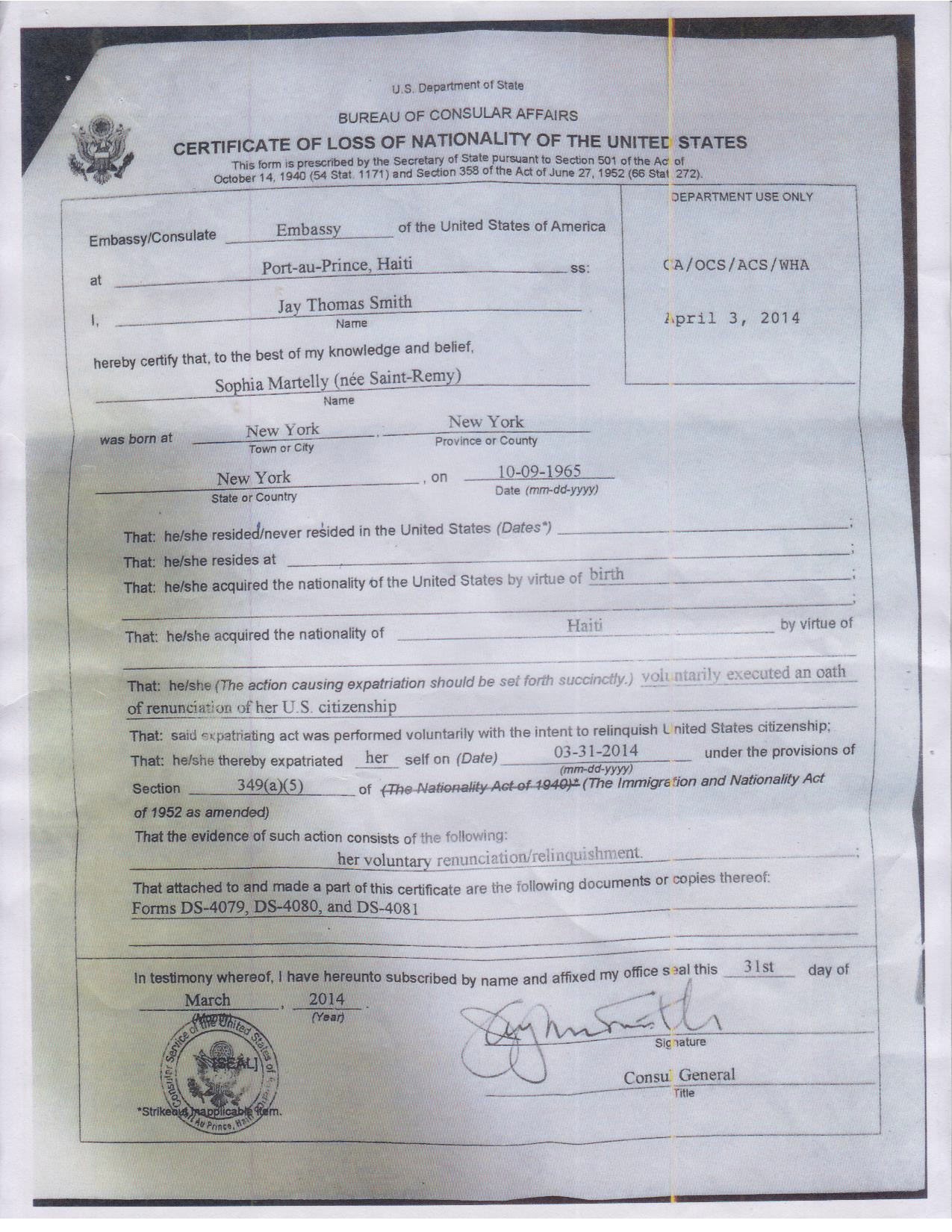 QUEEN SOPHIA ABANDONS HER AMERICAN CITIZENSHIP BUT THIS DOES NOT QUALIFY HER AS A CANDIDATE. WHAT ABOUT AMERICAN INTERNAL REVENUE SERVICE CLEARANCE FOR HER UNDECLARED MONEY STOLEN FROM HAITIAN PEOPLE??