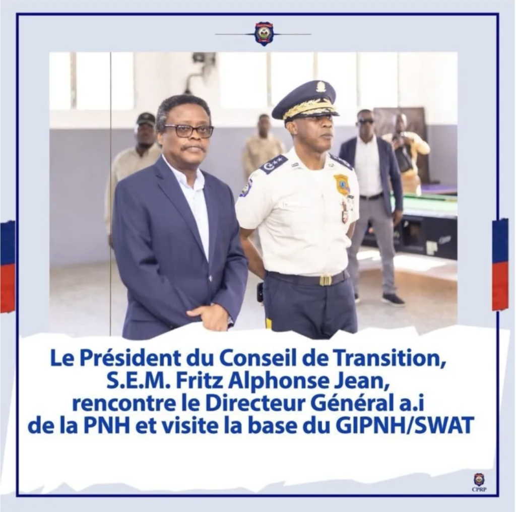 Ce jeudi 6 juin 2025, le coordonnateur du Conseil Présidentiel de transition (CPT), Fritz Alphonse Jean a visité la Direction Générale de la Police Nationale d’Haïti (DGPNH), sise à Clercine 8, commune de Tabarre. Un déplacement officiel durant lequel il a été reçu par le Directeur Général par intérim de la Police Nationale d’Haïti, Rameau Normil.