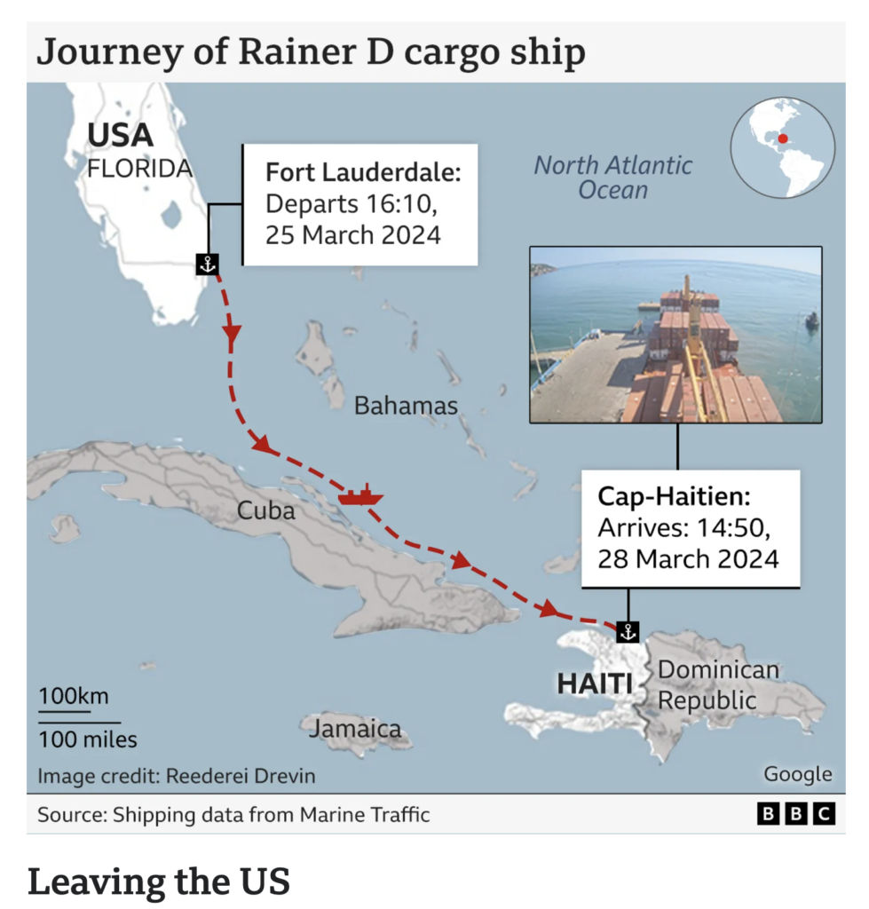 The shipment had travelled nearly 1,200km (746 miles) from Fort Lauderdale in Florida to Cap-Haitien in northern Haiti, on the Rainer D cargo ship.