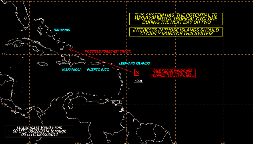 ABNT20 KNHC 221759 TWOAT TROPICAL WEATHER OUTLOOK NWS NATIONAL HURRICANE CENTER MIAMI FL 200 PM EDT FRI AUG 22 2014 For the North Atlantic...Caribbean Sea and the Gulf of Mexico: Shower and thunderstorm activity has increased during the past few hours in association with a small area of low pressure located just north of the Mona Passage between Puerto Rico and the Dominican Republic. Satellite wind data and preliminary reports from an Air Force Reserve Hurricane Hunter aircraft indicate that the circulation associated with the low is poorly defined. Some additional development of this system is possible today, but environmental conditions are expected to be more conducive for the development of a tropical depression or tropical storm when the disturbance moves near or over the southeastern Bahamas on Saturday. Regardless of whether the system becomes a tropical cyclone, gusty winds and heavy rainfall are expected across Puerto Rico and the Virgin Islands today, and over portions of Hispaniola and the southeastern and central Bahamas tonight and Saturday. Interests in the southeastern and central Bahamas should monitor the progress of this disturbance, as tropical storm watches or warnings could be required with short notice. * Formation chance through 48 hours...high...70 percent. * Formation chance through 5 days...high...80 percent. Forecaster Brennan