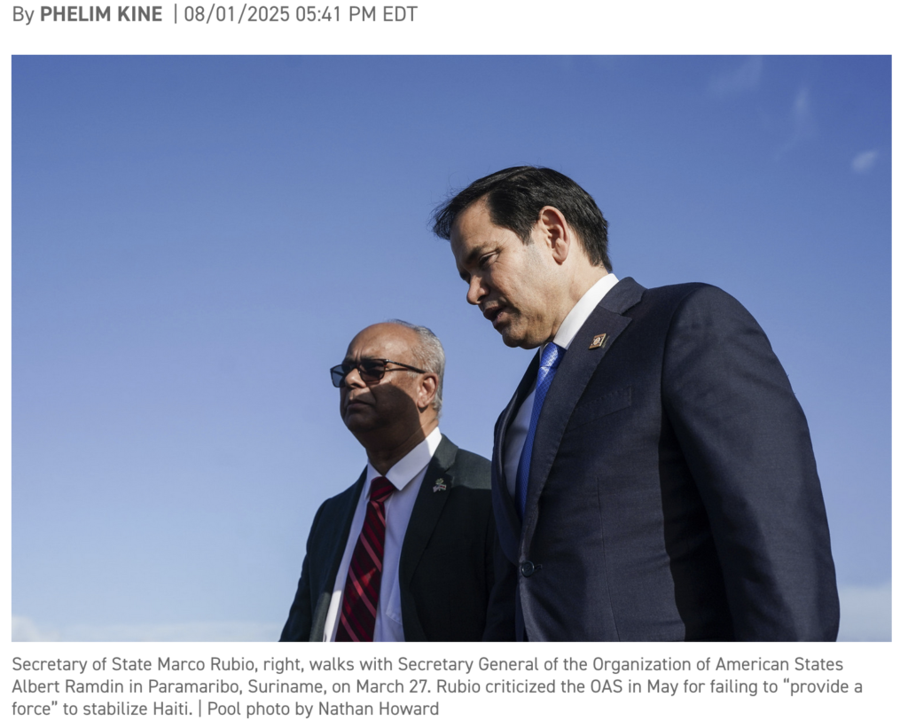 So far OAS has not impressed the Trump administration with its actions in Haiti. Secretary of State MARCO RUBIOcriticized the OAS in May for failing to “provide a force” to stabilize Haiti. Then in June, Deputy Secretary of State CHRISTOPHER LANDAU piled on. “If the OAS is unwilling or unable to play a constructive role in Haiti, then we must seriously ask ourselves why the OAS exists,” he said in a speech at the group’s General Assembly.
