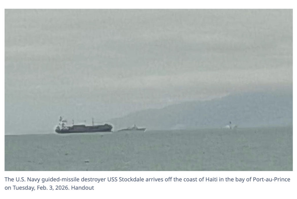 The U.S. Navy guided-missile destroyer USS Stockdale arrives off the coast of Haiti in the bay of Port-au-Prince on Tuesday, Feb. 3, 2026. Handout A U.S. warship has arrived off the coast of Port-au-Prince, Haiti, where two U.S. Coast Guard cutters are also patrolling nearby. The presence of the USS Stockdale comes as tensions continue to rise ahead of Feb. 7, the date marking the end of the mandate of Haiti’s nine-member Transitional Presidential Council. Although the council has agreed to step down — and some members have publicly said they would—others have continued to involve themselves in transition plans, despite warnings from U.S. officials that their term will end on Saturday.