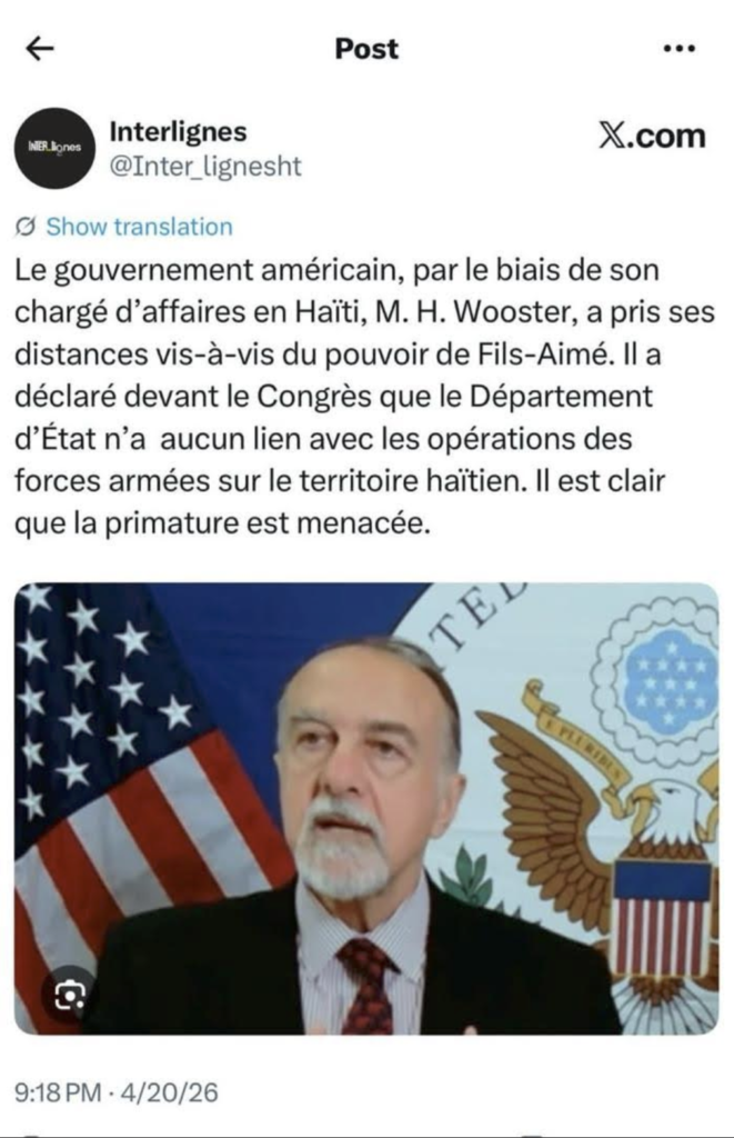 “The American government, through its chargé d’affaires in Haiti, Mr. H. Wooster, has distanced itself from the power of Fils-Aimé. He declared before Congress that the State Department has no connection with the operations of the armed forces on Haitian territory. It is clear that the prime minister’s office is threatened.”