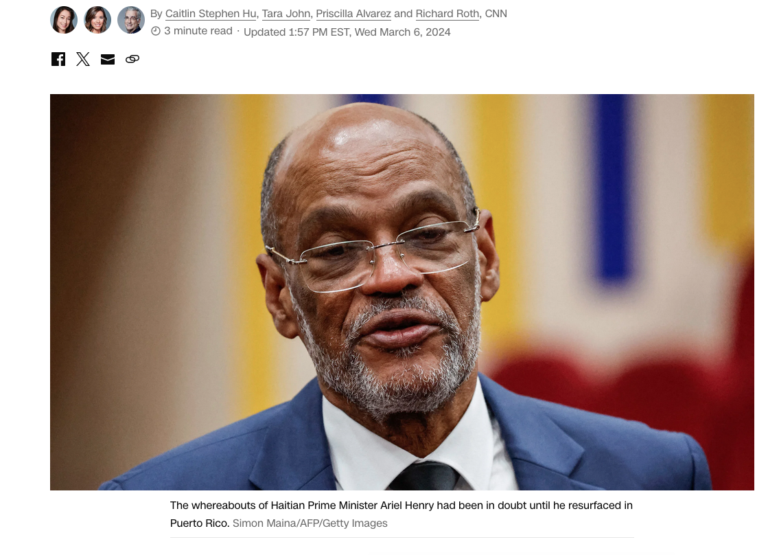 Henry landed in the US territory of Puerto Rico on Tuesday after days of speculation about his whereabouts. He had been in Kenya last week to sign an agreement securing a Kenyan-led multinational mission to restore security in the Caribbean nation; the Miami Herald reported on Wednesday that Henry then traveled to Washington for talks about Haiti’s political future.