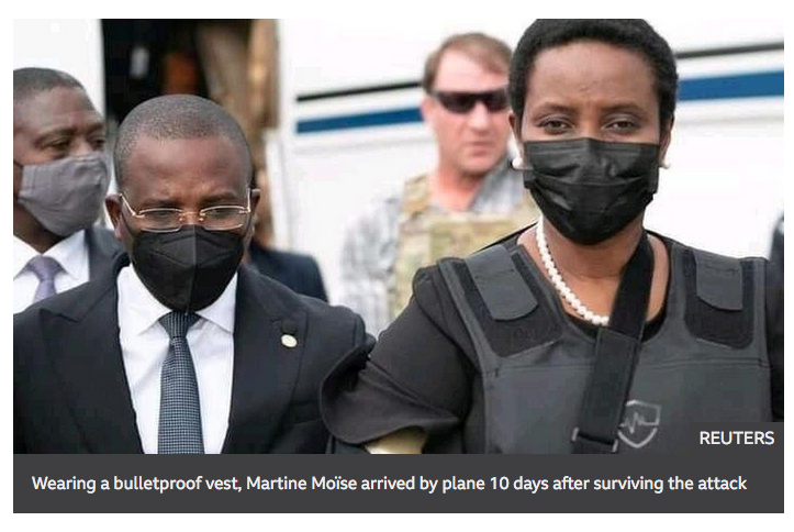 Martine Moïse was seen wearing an arm sling and a bulletproof vest after arriving by plane at Port-au-Prince airport on Saturday.